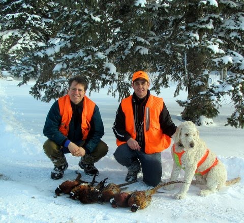 Then, the dynamic of hunters bringing different resources to a hunt, and new snow, brought a really great late-season pheasant hunt. On December fourth, my neighbor Eric and I went pheasant hunting at the farm of one of my family friends near Hutchinson, MN. The place is only hunted by neighbors who hunt each other's land and sections of swamp. Eric brought his dog, Brody, who wasn't intended to be a hunting dog, but has turned into one. Eleven inches of new snow brought birds that were holding very tight. After flushing an intial covey of at least fifteen birds, we flushed birds for the next two-three hours in the frozen swamp. The first flush quickly produced two kills, and after working the huge swamp, we had a couple more, and had missed a few others. Working our way back to the woods, a nice flush set up and we had the fifth, one short of our limit. We downed our sixth in the woods where we started.